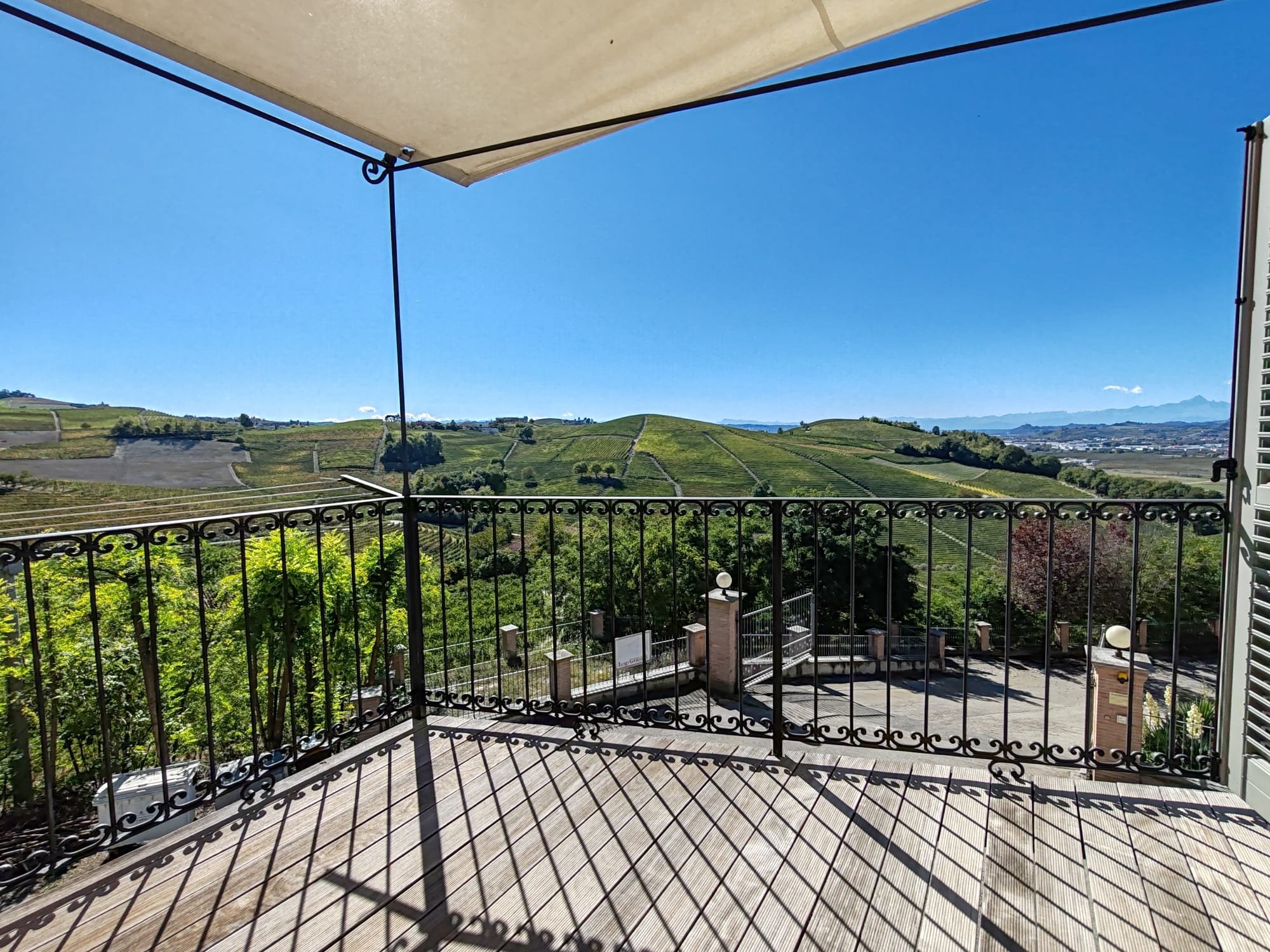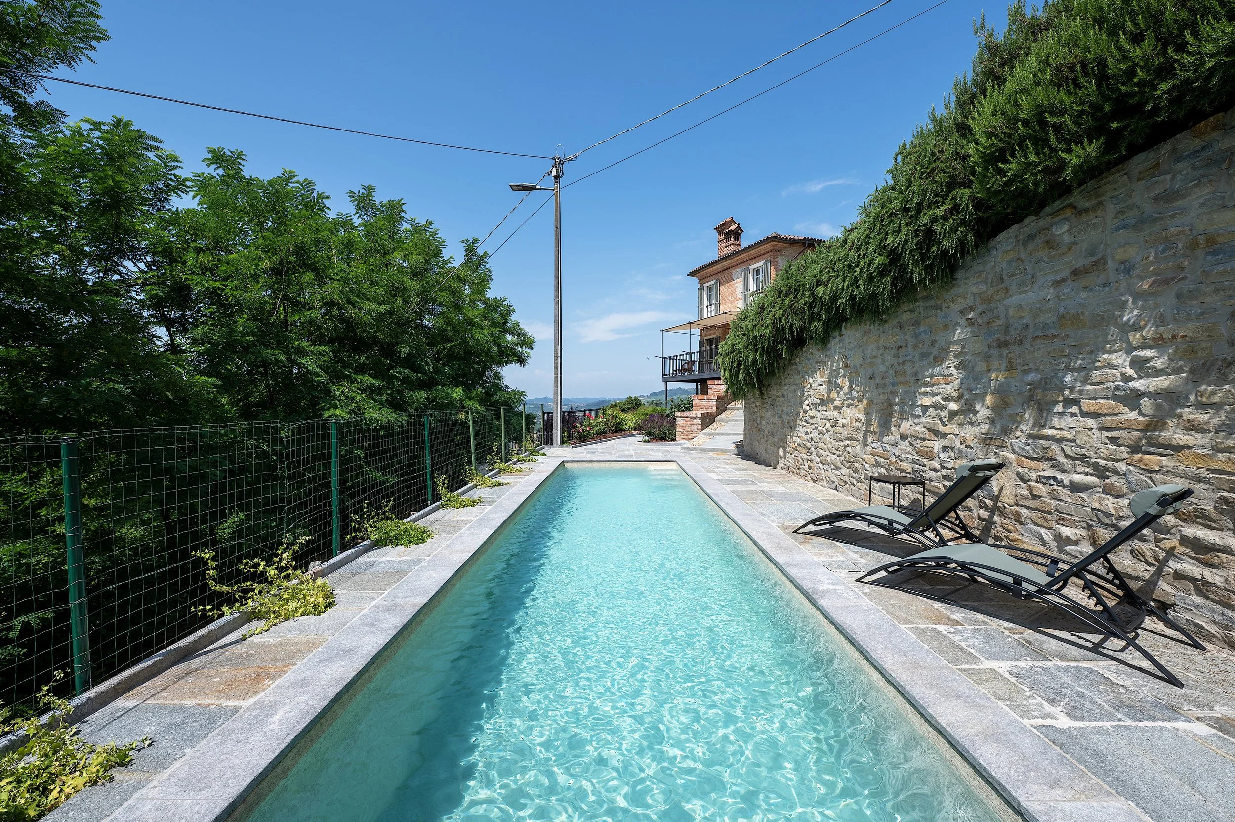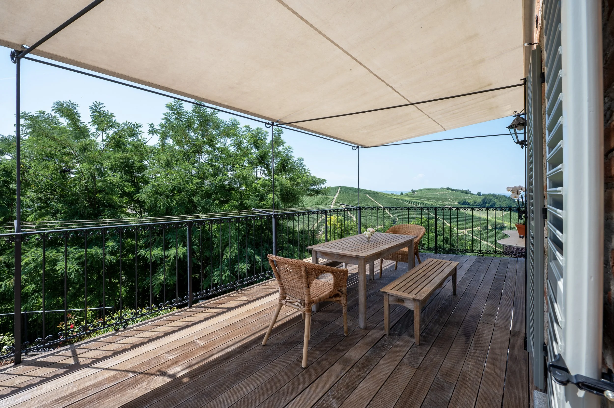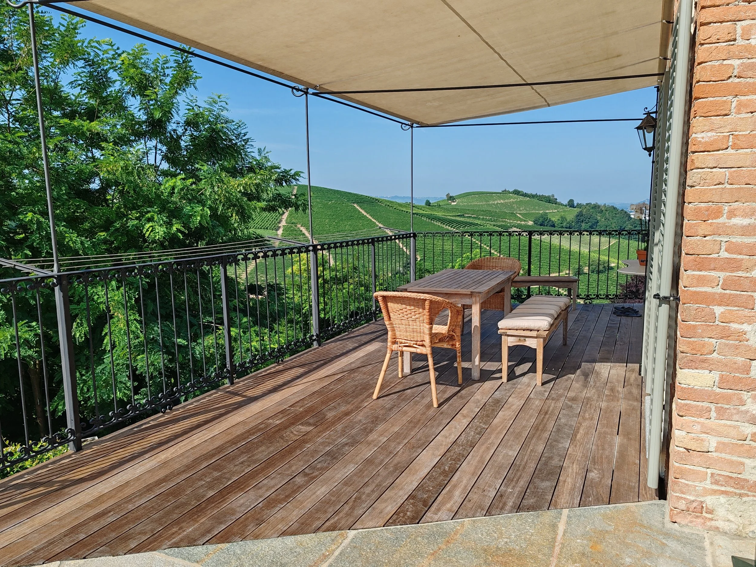 Salendo sulla terrazza panoramica, il paesaggio si apre sulle dolci ondulazioni delle Langhe; qui ci si può rilassare davanti a un panorama mozzafiato, assaporando la pace che solo questi luoghi sanno offrire. La vista dall’alto abbraccia i filari dei vigneti e le colline che si perdono all’orizzonte, regalando emozioni diverse in ogni stagione, tra colori da cartolina e momenti di assoluta quiete. Ogni dettaglio esterno, dalla pietra al verde, è pensato per vivere la bellezza autentica delle Langhe e l’autenticità di una dimora storica rinata per accoglierti