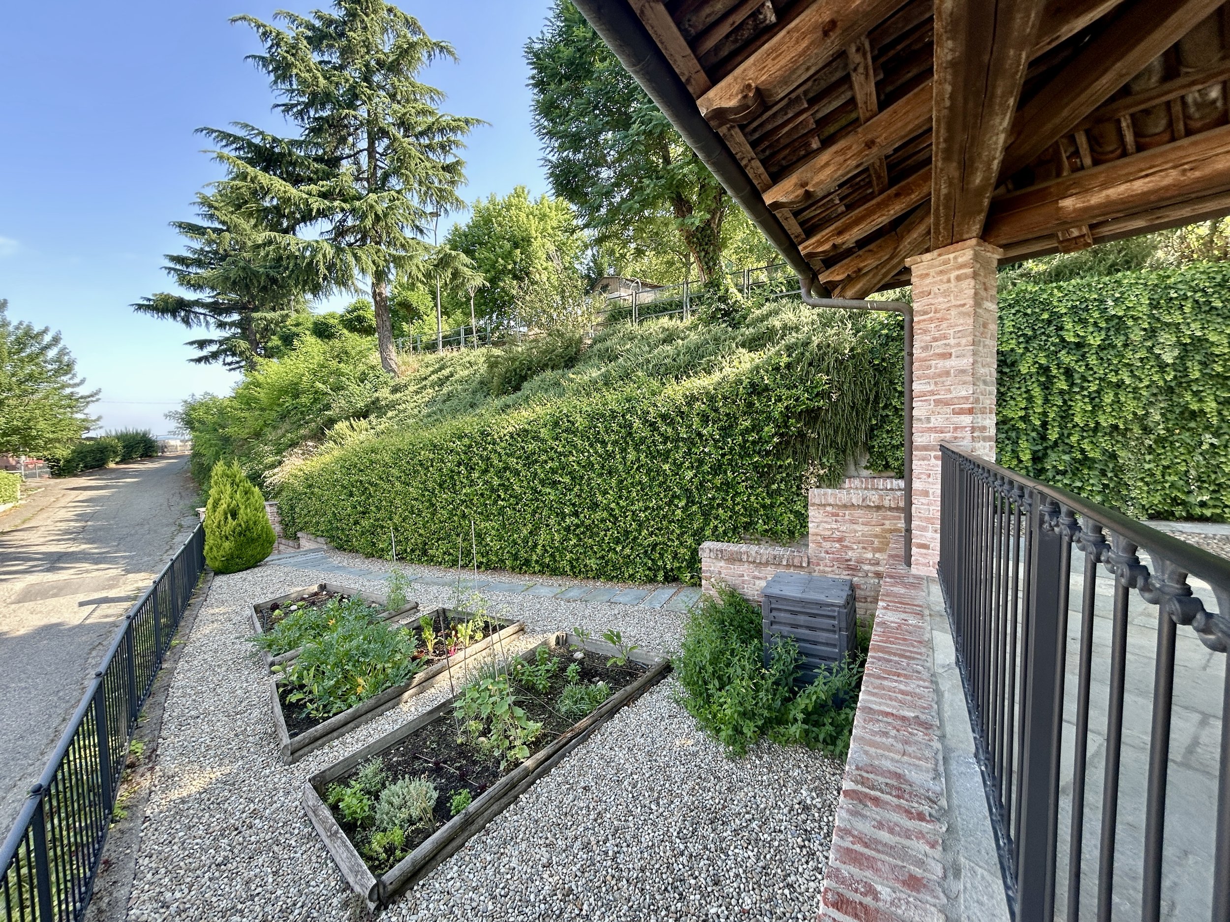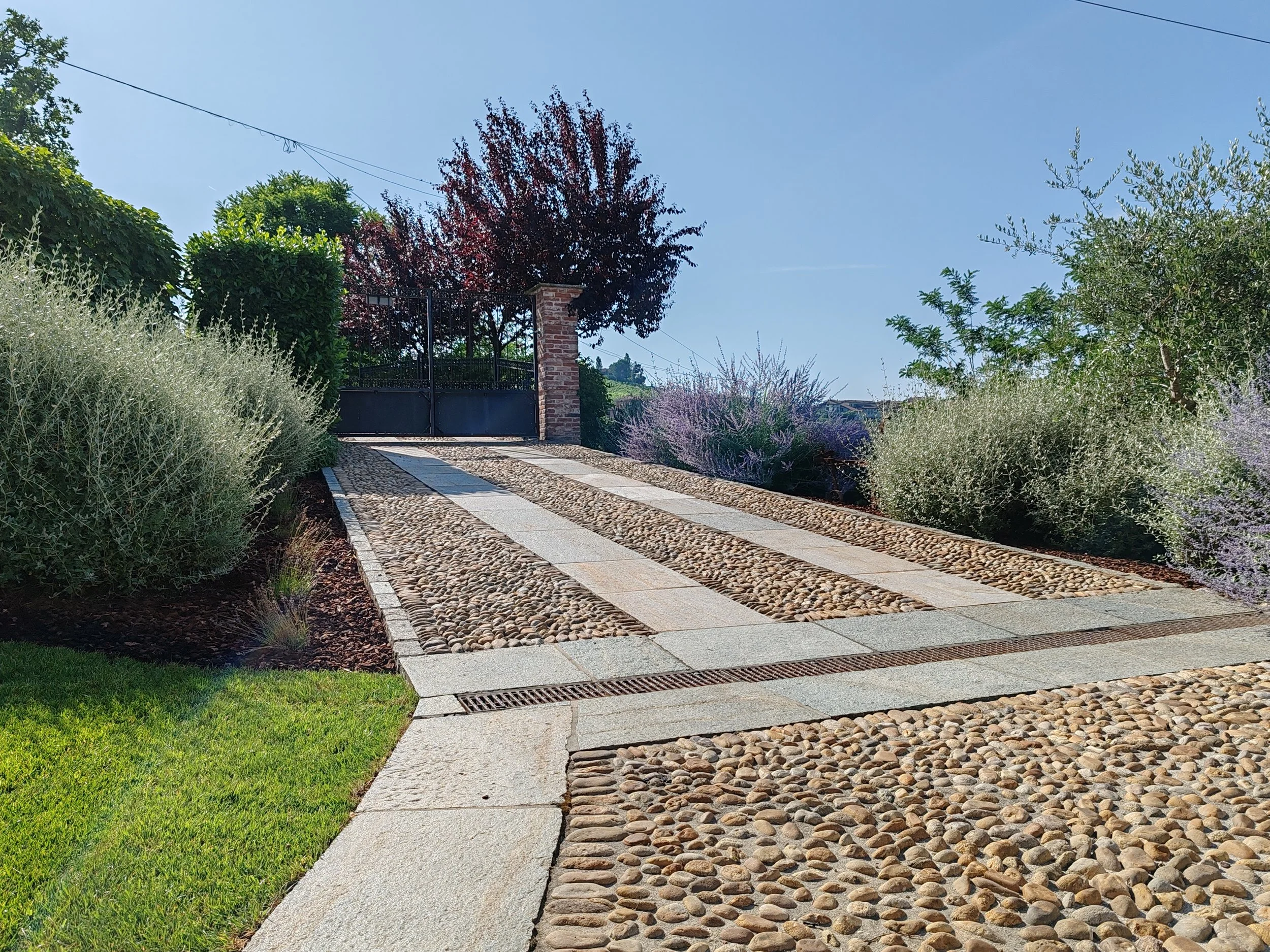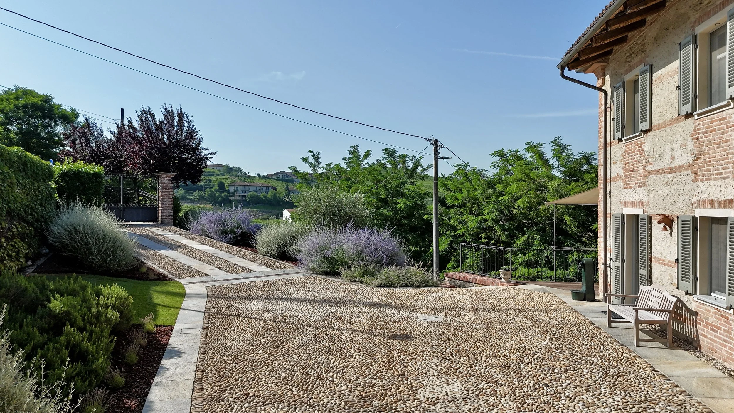 Gli esterni di Casa La Valle raccontano un viaggio autentico tra storia e paesaggio piemontese . Si viene accolti da un vialetto curato, lastricato con pietre e ciottoli antichi, fiancheggiato da lavanda in fiore e arbusti sempreverdi che profumano l’aria e regalano subito eleganza e tranquillità. La facciata della villa, con i suoi mattoni e pietre a vista, sprigiona fascino senza tempo mentre le persiane grigio-verdi e il tetto in coppi si fondono con la natura circostante.
