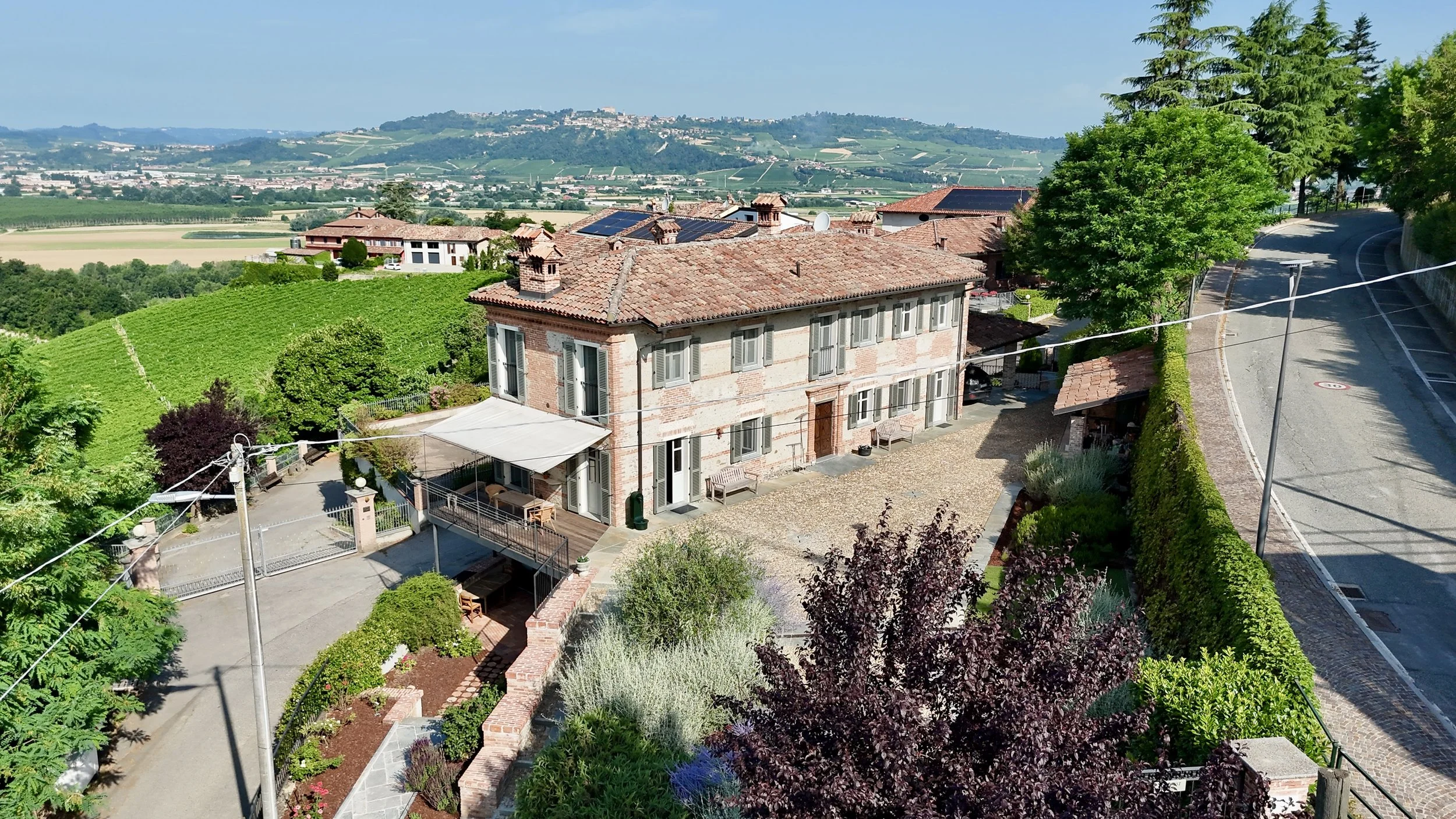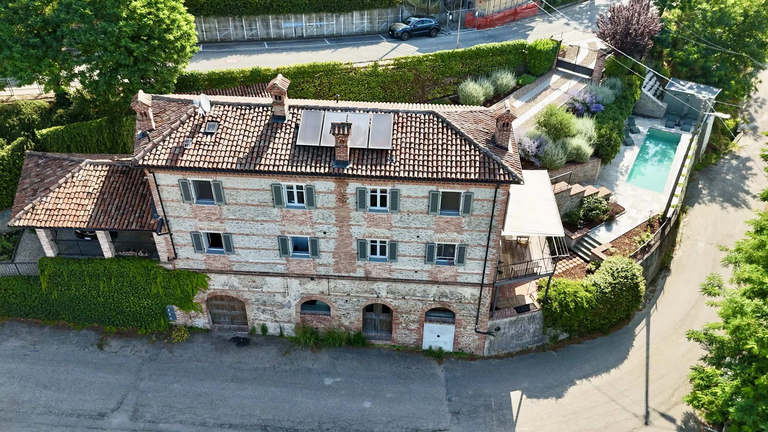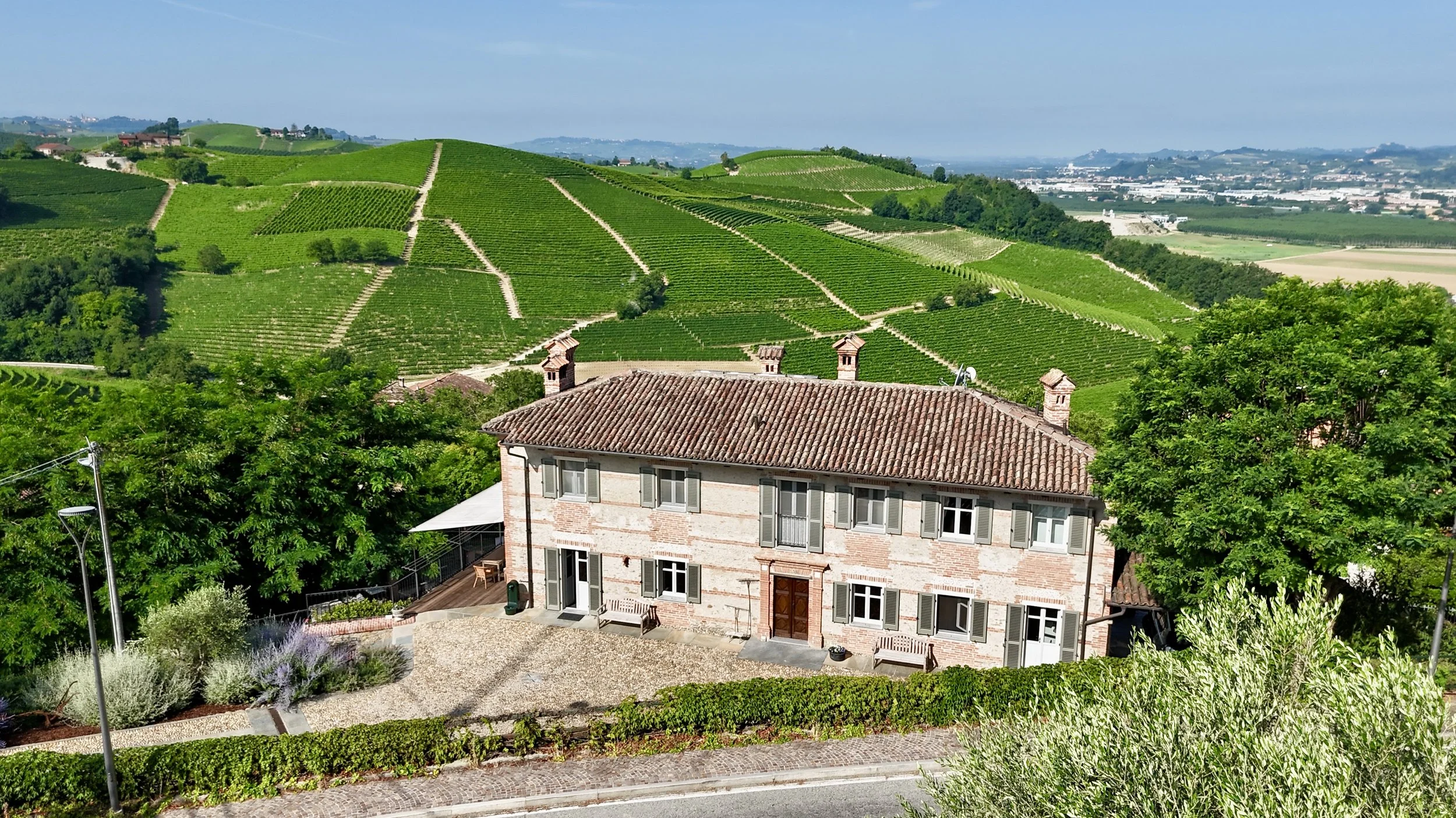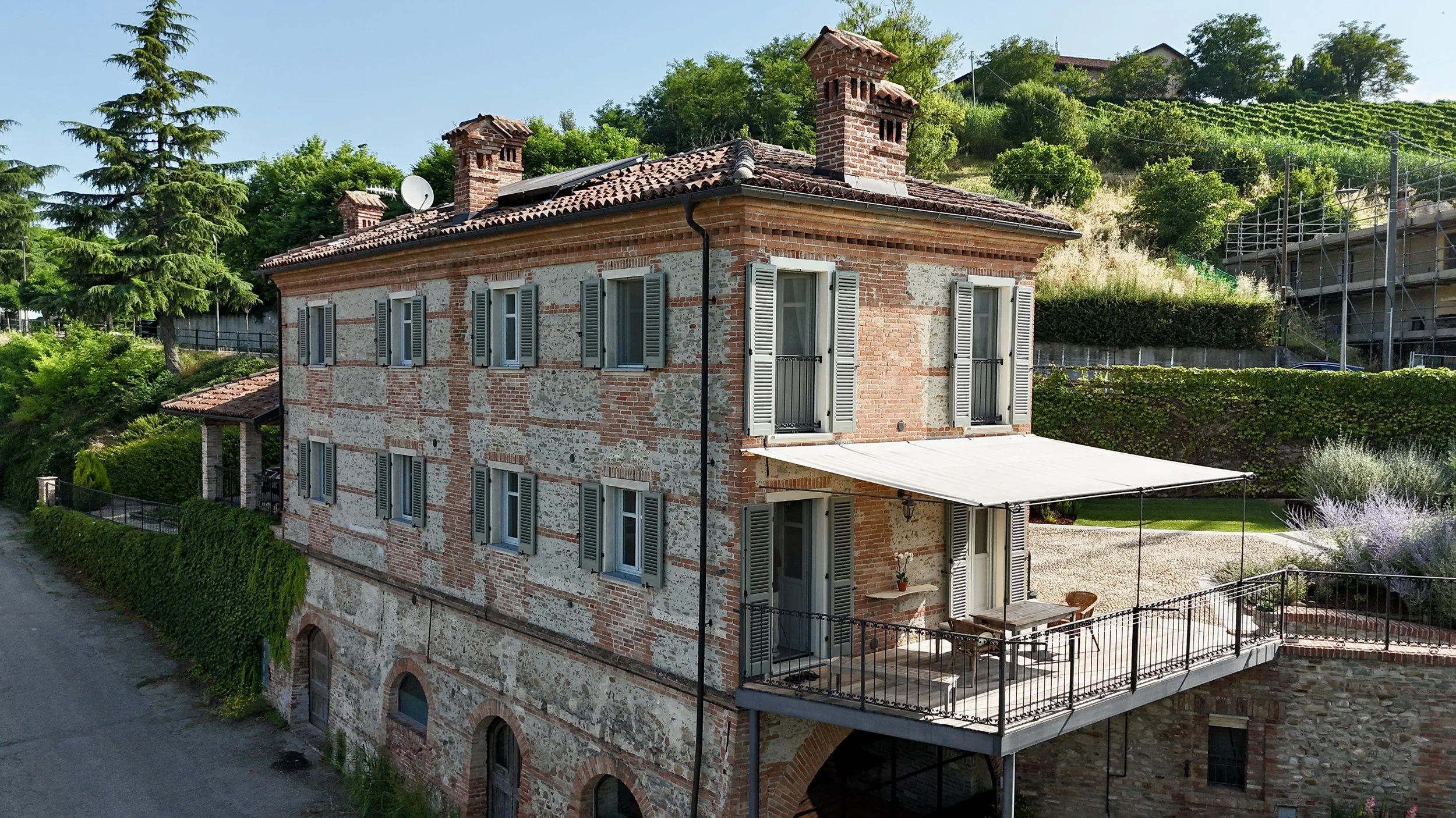 Casa La Valle incarna lo charme e l’eleganza delle dimore storiche piemontesi . La sua imponente facciata, realizzata in mattoni e pietra locale, è valorizzata da dettagli architettonici autentici e dalle persiane in legno che conferiscono ordine ed equilibrio. Il tetto in coppi antichi sottolinea il carattere senza tempo della proprietà, mentre gli arredi esterni e il cortile in ciottoli offrono scorci di accoglienza e relax.