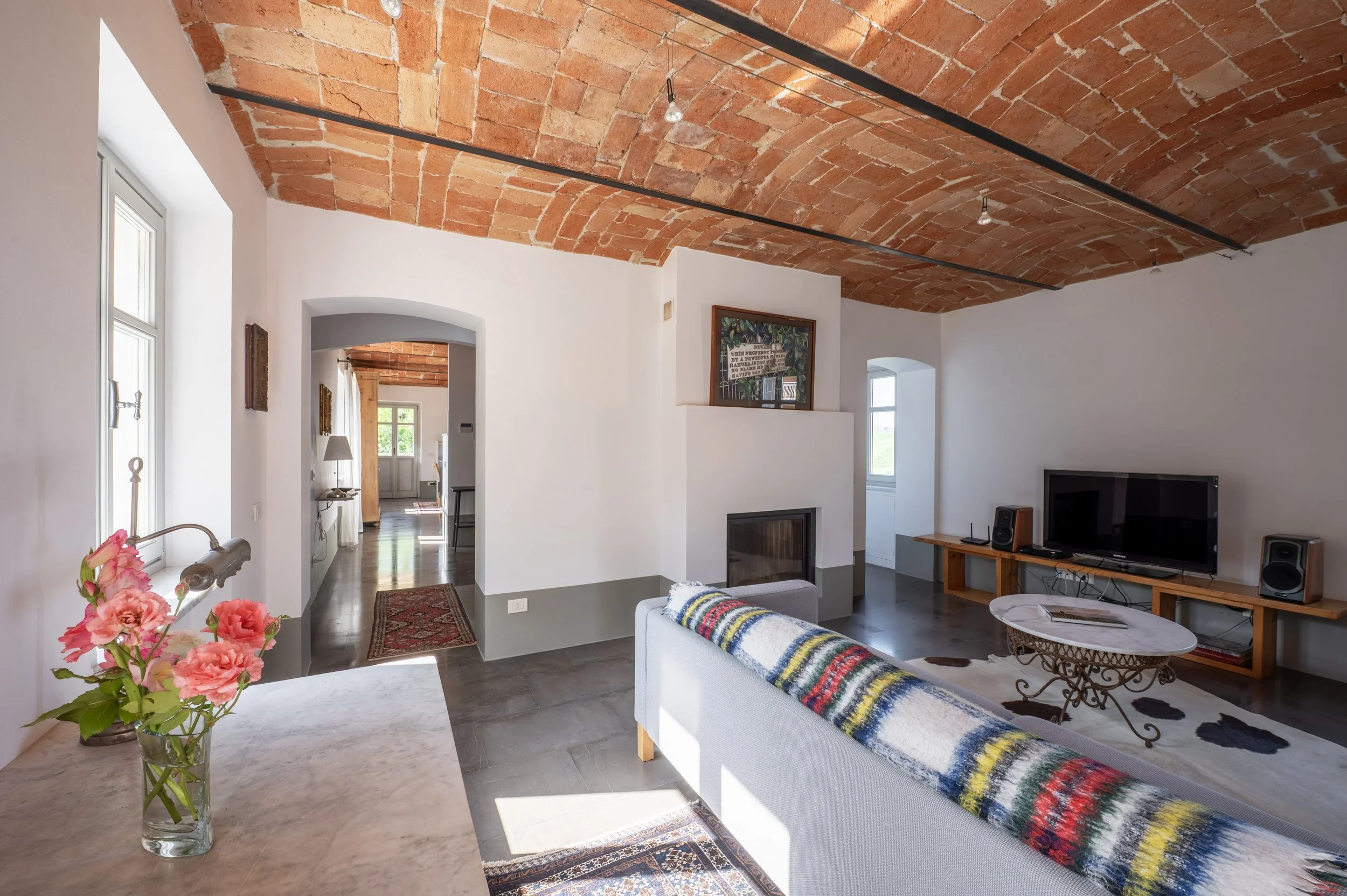 Il soggiorno di questa villa rappresenta l’essenza dell’accoglienza e della raffinatezza tipica delle dimore storiche delle Langhe. Caratterizzato dallo scenografico soffitto a volte in mattoni piemontesi, il salone è pervaso da una luce naturale che valorizza la purezza delle pareti bianche e il tono caldo dei materiali originali. L’ampio camino contemporaneo, incastonato in una parete essenziale, aggiunge un tocco di modernità, creando il punto focale di uno spazio intimo e conviviale.