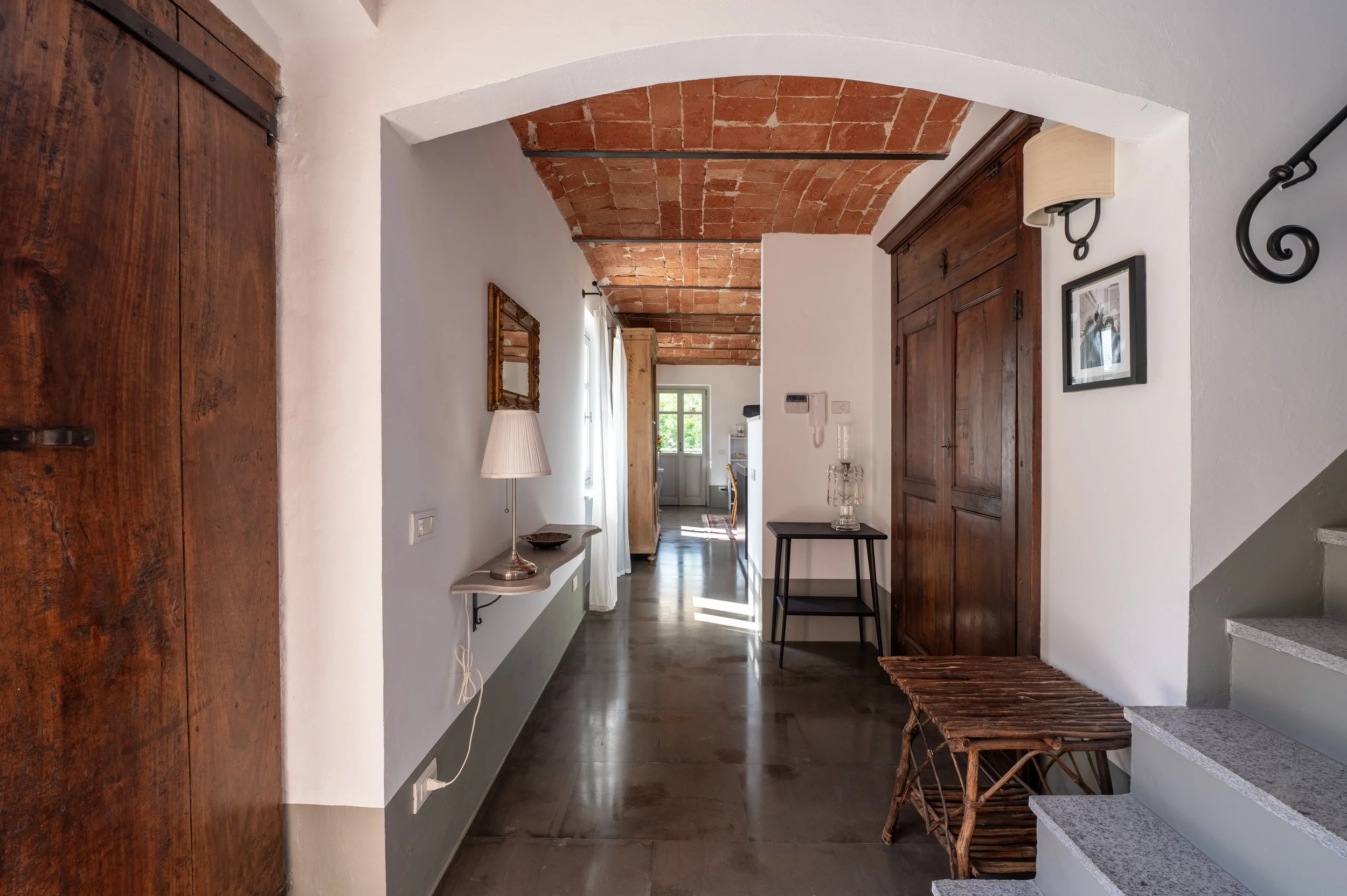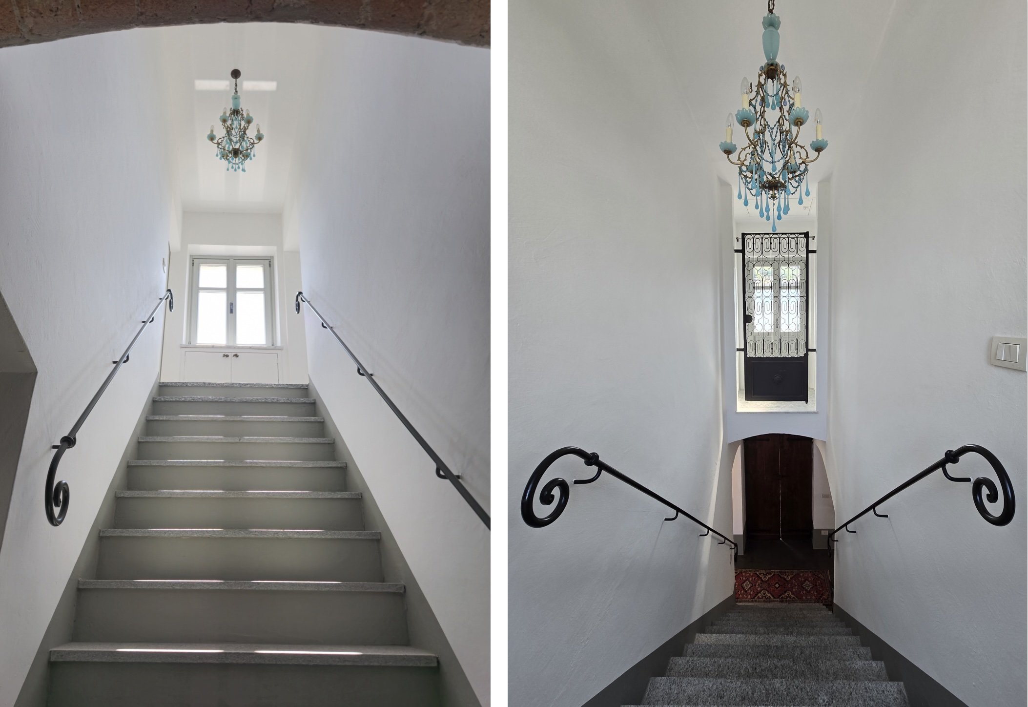 Pareti chiare e soffitto a volta rendono l’ambiente luminoso ed elegante, arricchito da dettagli artigianali in ferro battuto e da un lampadario d’epoca. La scala collega i diversi piani della casa ed è impreziosita da una grande finestra panoramica e un antico portone vetrato, simboli dell’accoglienza autentica delle dimore storiche delle Langhe .