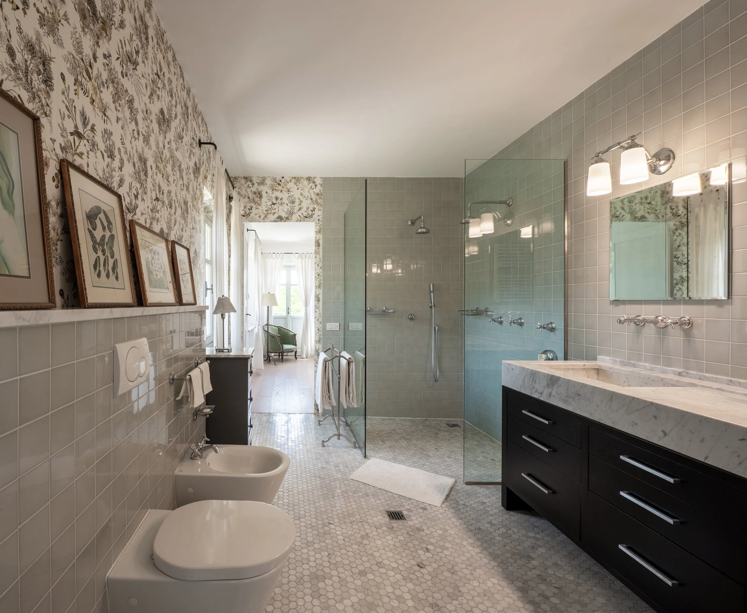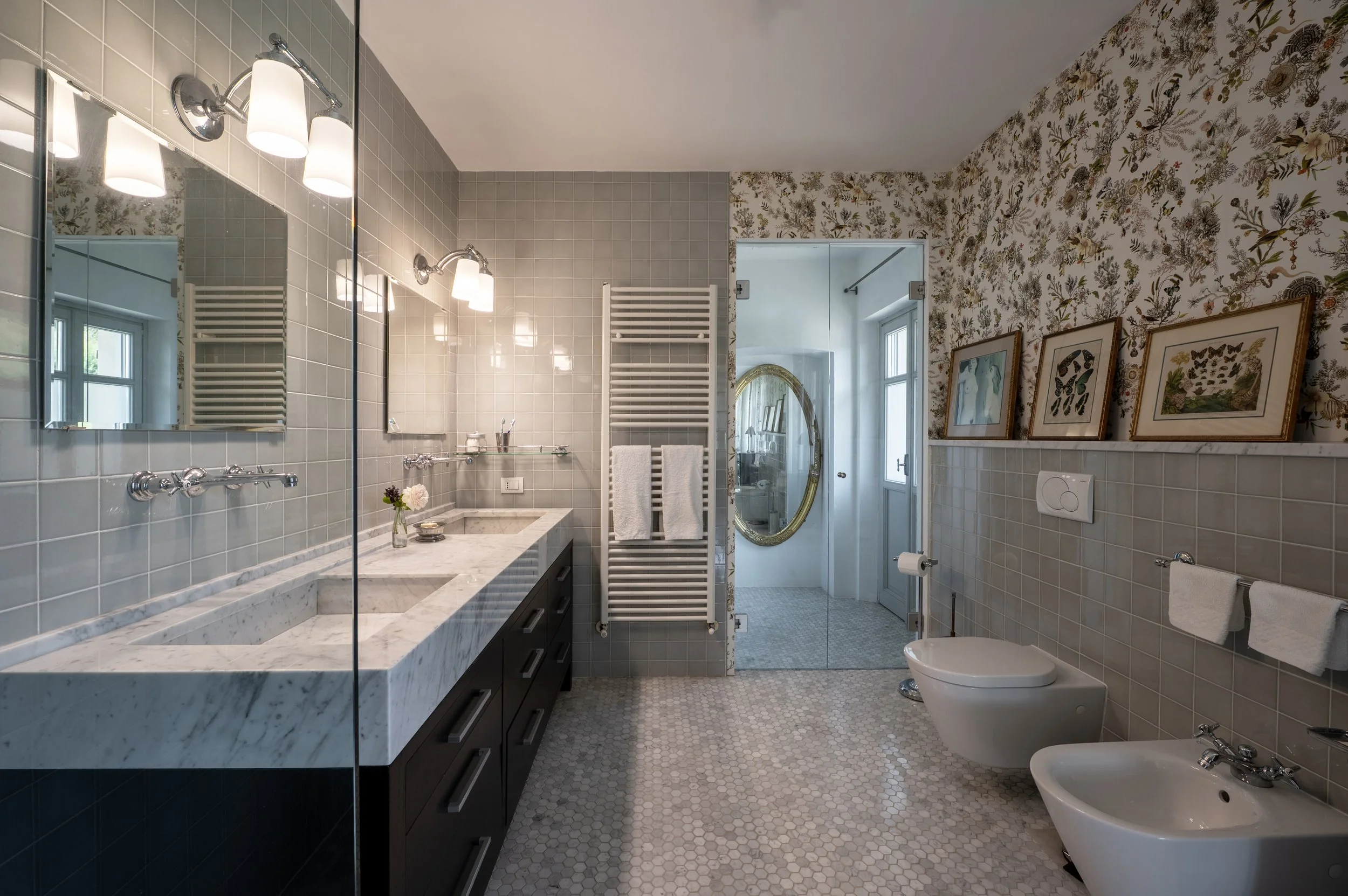 Bagni ampi e luminosi, rifiniti con materiali pregiati e dettagli d’epoca, pensati per offrire comfort e benessere in un contesto di autentica eleganza