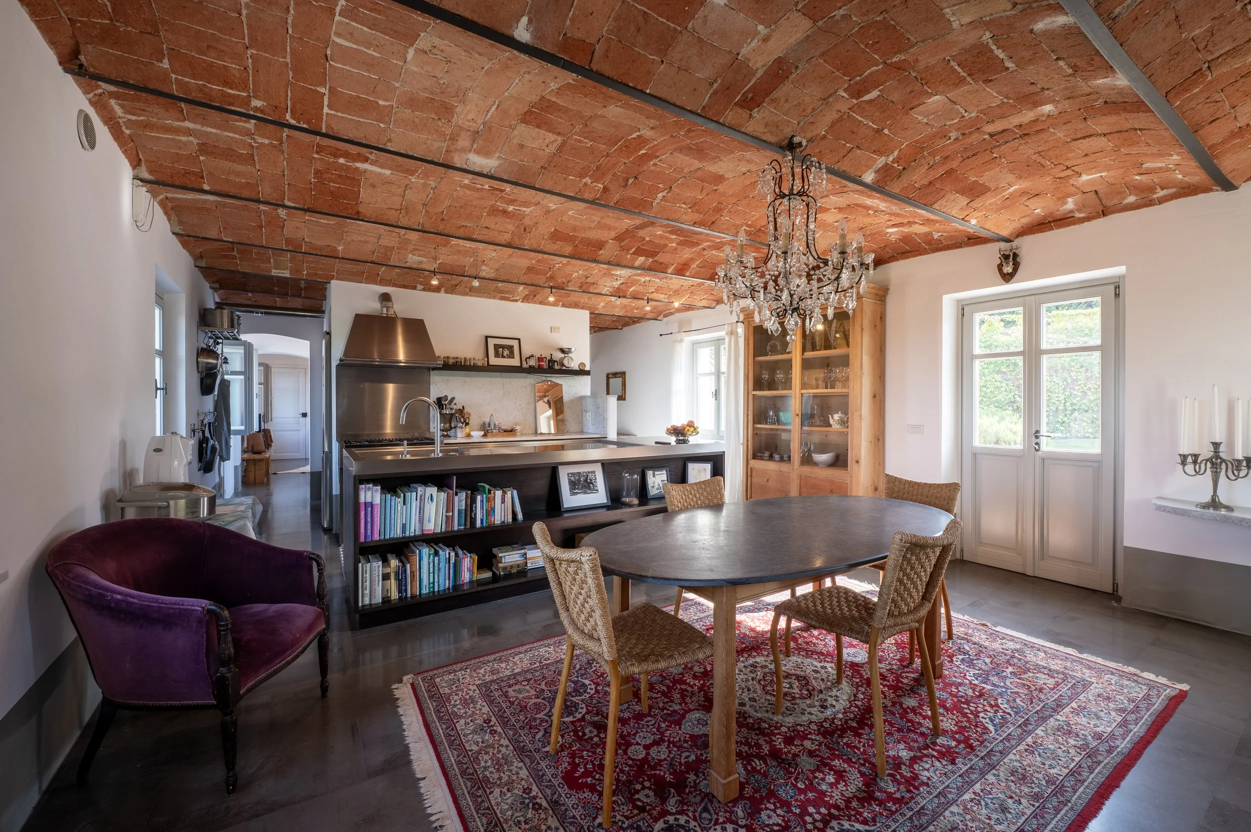 L’ampio spazio cucina si apre su una zona pranzo luminosa e conviviale, inondato di luce grazie alle grandi finestre che incorniciano il paesaggio verde circostante. Il soffitto a volte in mattoni antichi dialoga con le linee essenziali dell’isola centrale in acciaio inox, dove funzionalità ed eleganza si incontrano, mentre il pavimento decorato e la vetrina in legno aggiungono un tocco di classicità e calore.