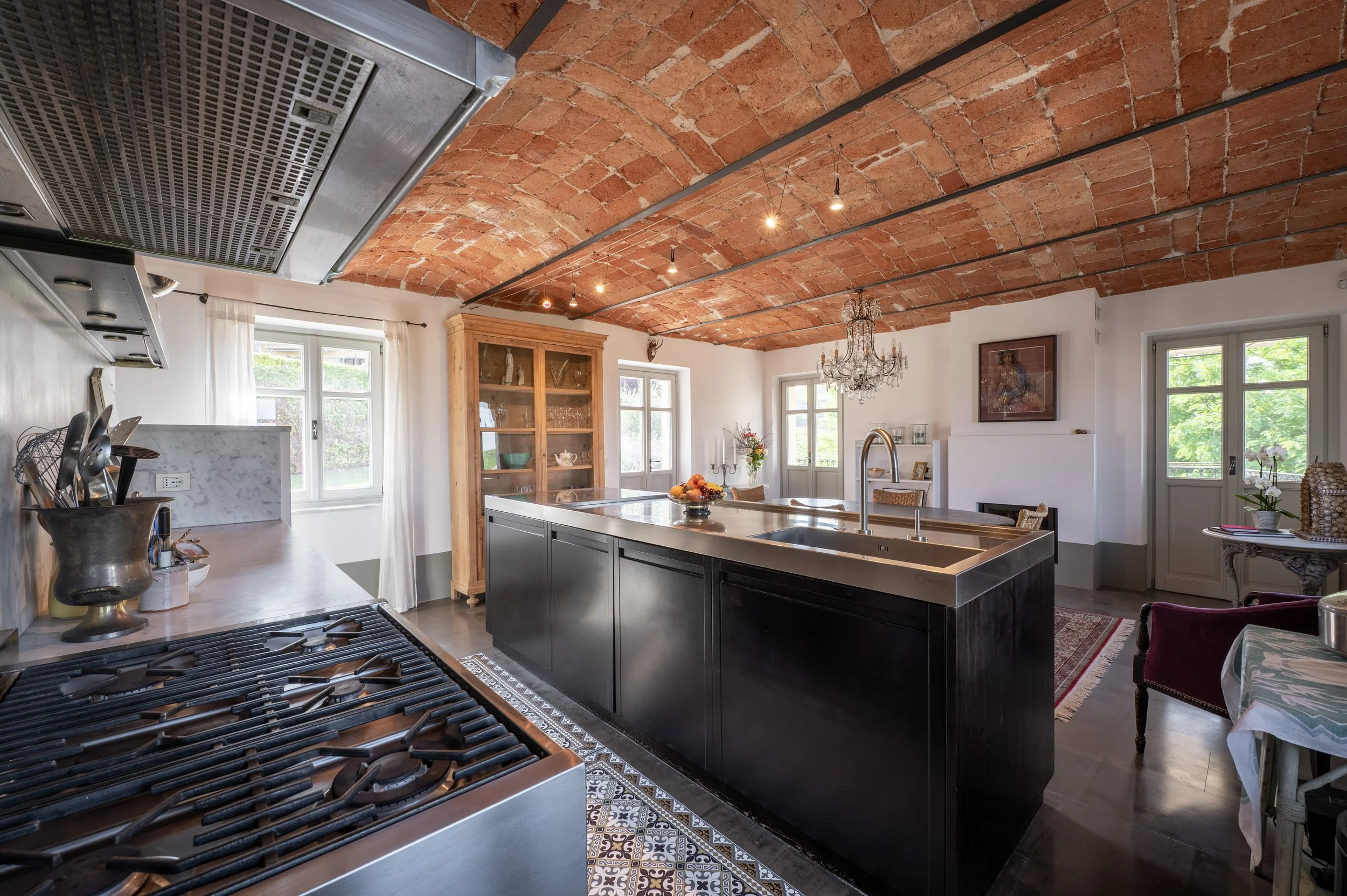 La cucina della villa incarna la fusione perfetta tra tradizione e modernità, immersa sotto uno scenografico soffitto a volte in mattoni piemontesi che dona calore e autenticità all’ambiente. L’abbondante luce naturale filtra dalla finestra centrale, valorizzando gli elementi sartoriali di questo spazio: una sontuosa isola in acciaio inox si affianca a superfici artigianali in legno scuro, mentre il marmo di Carrara, con le sue delicate venature, decora il piano di lavoro e aggiunge un raffinato tocco di eleganza senza tempo