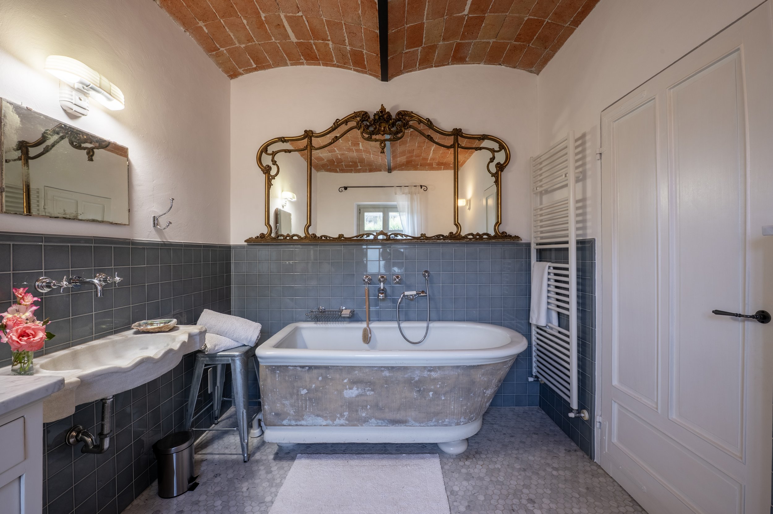 Un ambiente di autentico charme, in cui passato e comfort moderno si fondono armoniosamente. La vasca in porcellana di origine antica richiama la tradizione, mentre le superfici in marmo e l’ampio specchio dorato amplificano la luce naturale e valorizzano ogni dettaglio architettonico. Il soffitto a volta in mattoni, abbinato ai toni delicati delle piastrelle e agli arredi su misura, dona all’insieme un’atmosfera di esclusiva eleganza e rilassante benessere