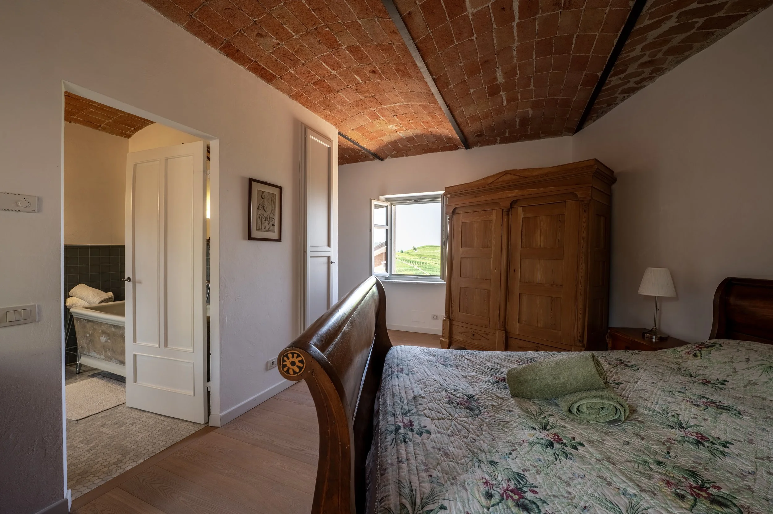 La camera gode di luce naturale grazie alla finestra con vista sui vigneti delle Langhe, offrendo scorci suggestivi sul paesaggio circostante. Il bagno adiacente, con accesso diretto, è impreziosito da una vasca di origine antica e finiture di pregio che uniscono tradizione e comfort moderno, rendendo questo spazio ideale per relax e privacy