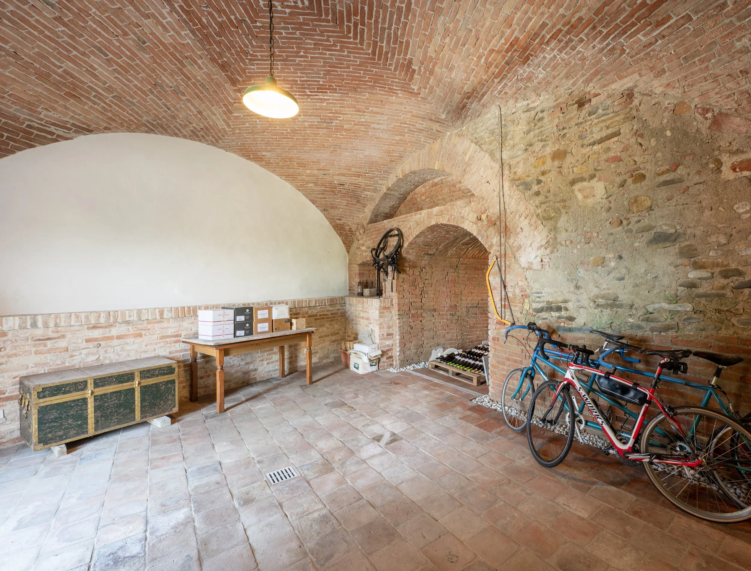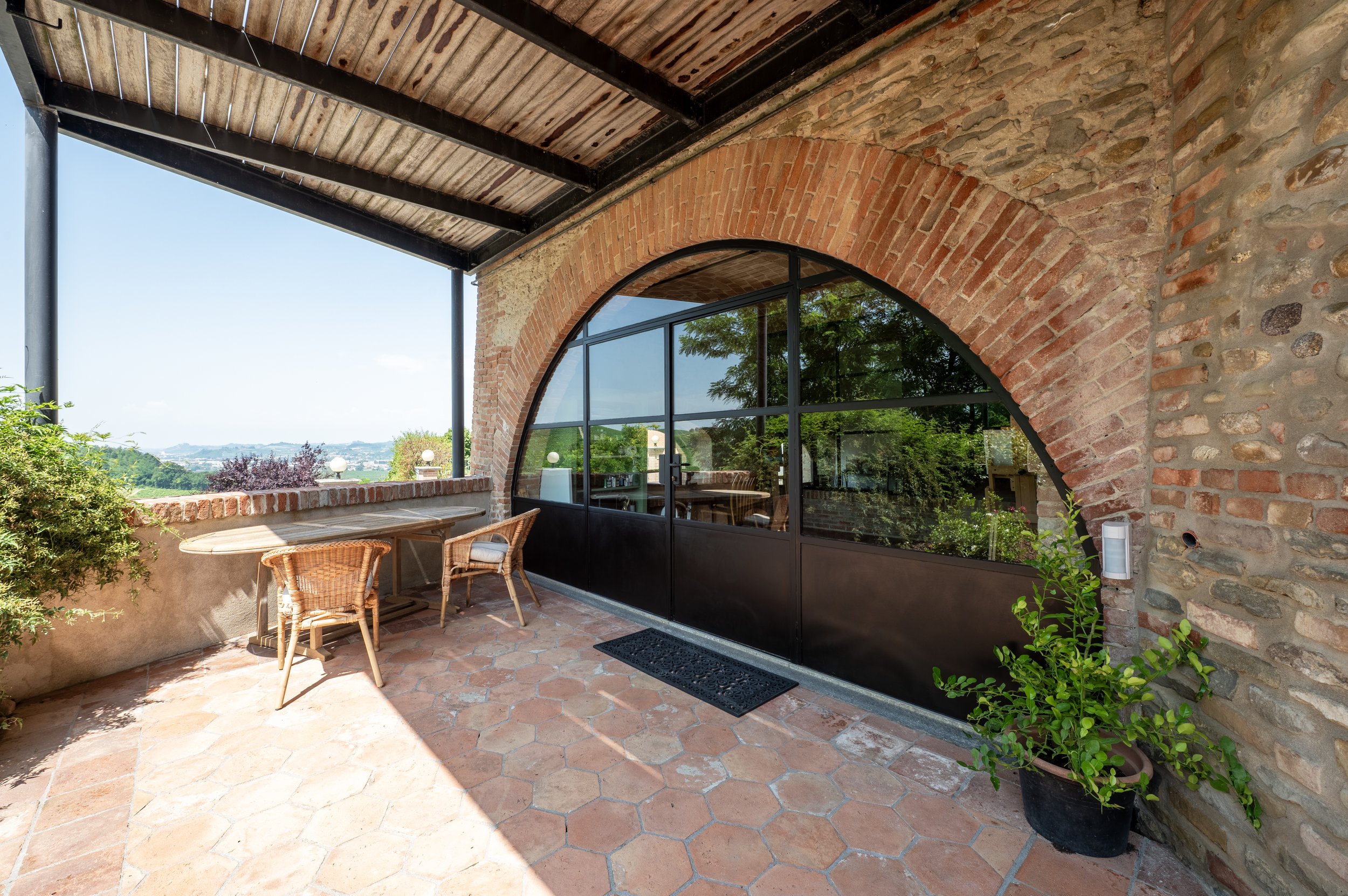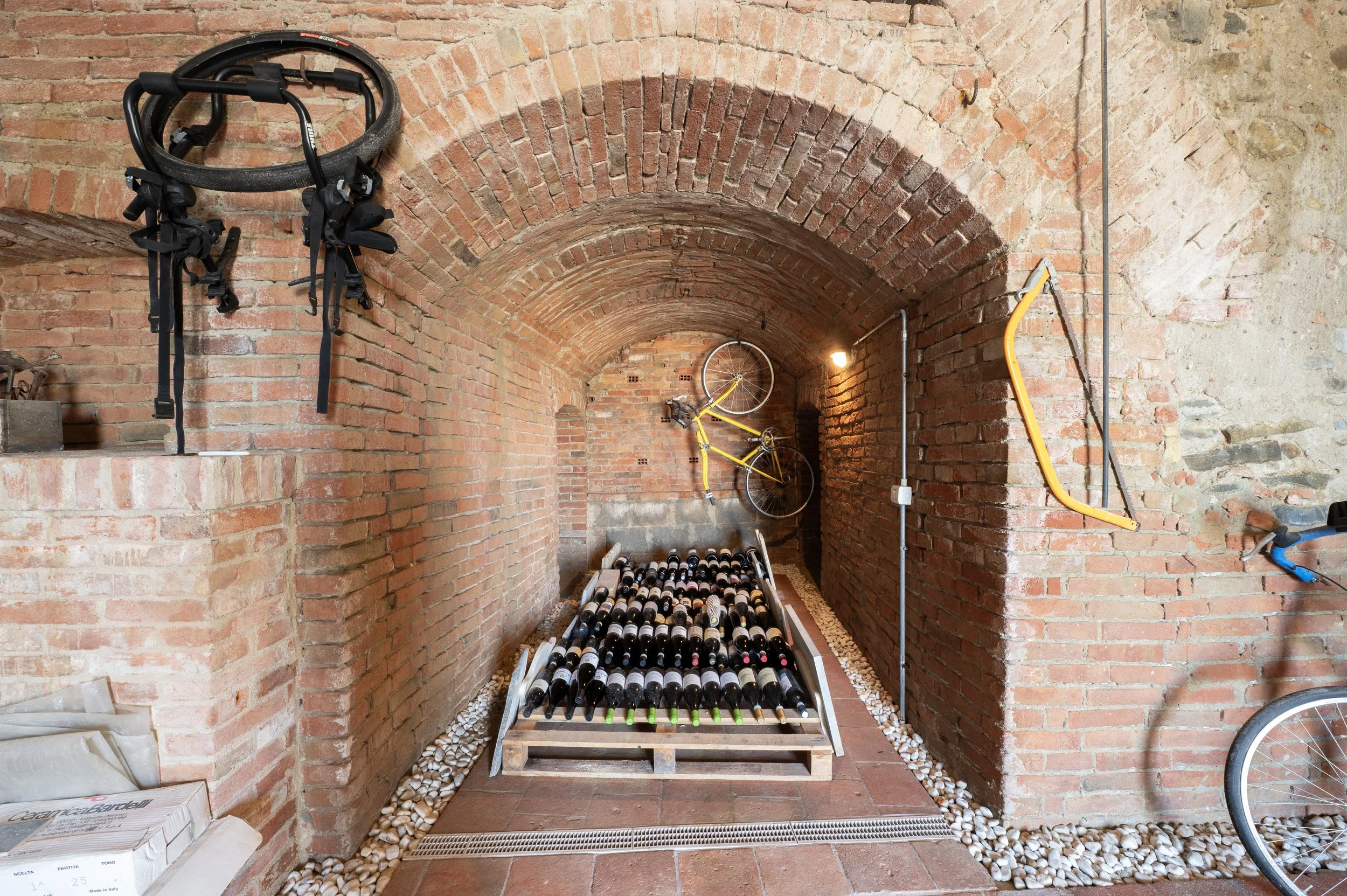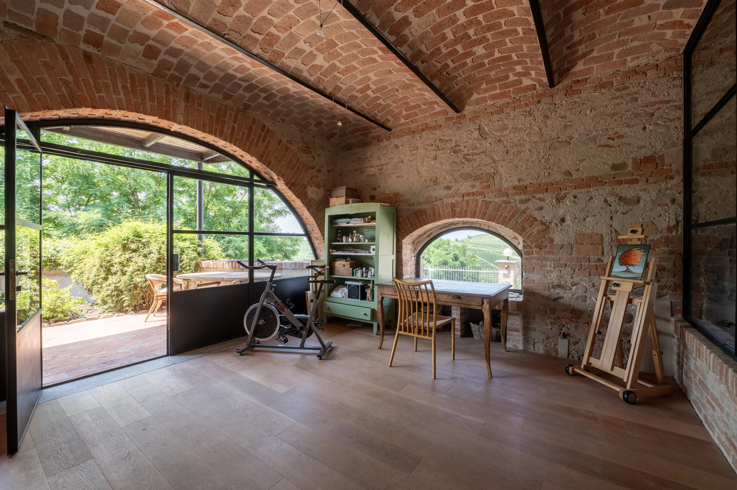 L’arco in mattoni, la scala a chiocciola in ferro battuto e le aperture ribassate donano dinamicità agli ambienti, mentre la presenza della porta in legno e del camino originale evocano l’uso tradizionale della cantina. L’ampia vetrata sul fondo collega l’interno con il paesaggio esterno, offrendo una vista sul verde dei vigneti. Ogni particolare racconta la maestria e la cura nella conservazione dei materiali originali, mantenendo intatto il legame con la storia e la cultura locale