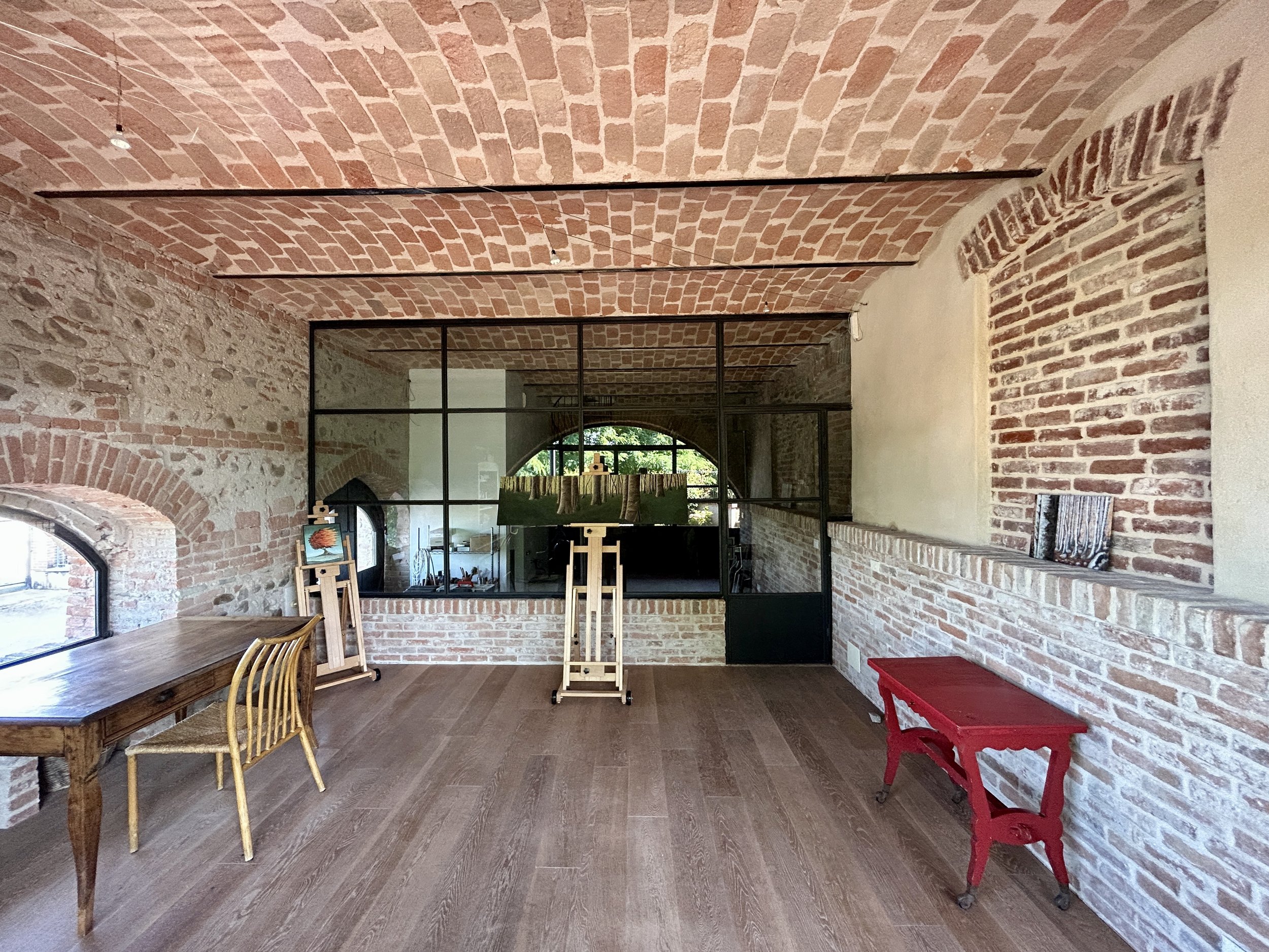La presenza delle grandi vetrate consente alla luce naturale di valorizzare ogni dettaglio, offrendo una vista sulle altre aree della cantina e sul paesaggio esterno. Gli arredi in legno e gli elementi artistici presenti suggeriscono la vocazione dello spazio come atelier d’artista, area studio o zona relax, aprendo infinite possibilità di utilizzo in un ambiente ricco di atmosfera e charme
